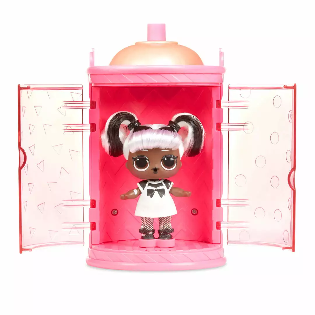 New hairspray can capsule transforms into a salon chair, display case, doll stand, or purse. Feed or bathe doll to discover a water surprise, including color change!