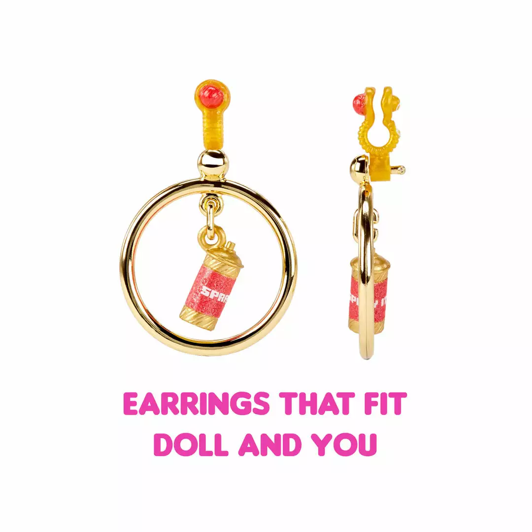 Her package becomes an unboxing station playset. Set up her included table, chair and backdrop to create the perfect setting to unbox. Then, help M.C. Swag unbox all her fashion finds, including a jacket, skirt, shoes, backpack and more from cute packages. She even has sweet earrings that are wear and share. Put them on her, or add the included attachments, so you can wear them, too!