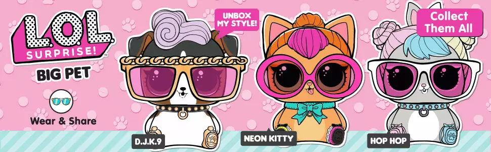 LOL Surprise Big Pets have tons of surprises inside and include wear-and-share accessories for you! Put on the Eye Spy series spy glasses to find codes and unlock surprises, and then share the glasses with your Big Pet! And her necklace becomes a bracelet for you! Comes with 1 wish bone, 1 funny bone, 1 fortune teller heart, 1 baby reveal. Hop Hop can be worn as a backpack or used as a piggybank. Also comes with a light pink purse carrying case.