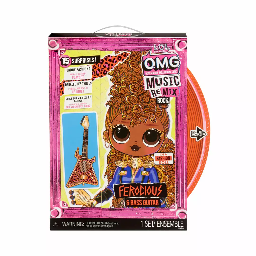 Unbox LOL Surprise OMG Remix Rock fashion doll โ Ferocious โ with 15 surprises including an instrument. Ferocious is a member of the Super Sonix, the rockstar band behind the hit โIโm a Queen.โ She has stunning features, beautiful, styled hair, and her own outrageous, rock star style. She’s the big sister to fan favorite LOL Surprise character, Fierce, and she’s ready for the ultimate concert.ย