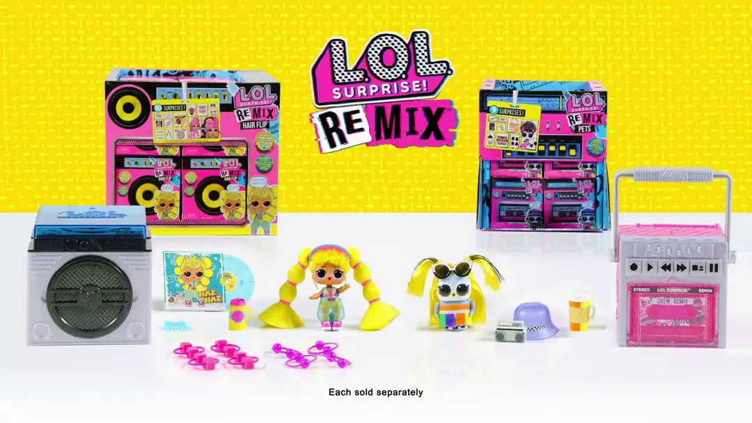 Collect all 12 LOL Surprise Remix Hair Flip Tots. Collect to build a boombox by connecting 2 LOL Surprise Hair Flip Tots and 1 LOL Surprise Remix Pets packages. Collect music and lyrics from the entire LOL Surprise Remix line to complete the whole song. Or, mix & match lyrics to create your own remix.