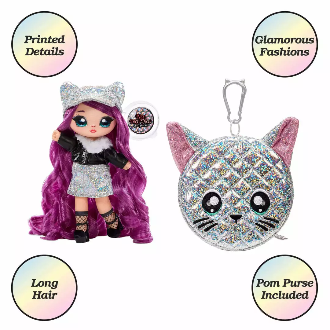 Level up your glam game with the Na Na Na Surprise 2-in-1 Soft Fashion Doll Glam Series! You get 2-in-1 value with a soft fashion doll plus a collectible clip-on metallic fabric animal pom purse!