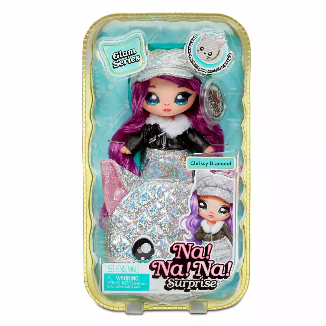 Na Na Na Surprise dolls are the first-ever soft, posable fashion dolls with printed face and fashion details. Now featured in a window box to show off all the quality details, it will be easier than ever to collect them all!​ Chrissy Diamond comes with a tag with her name, birthday and a little about her.