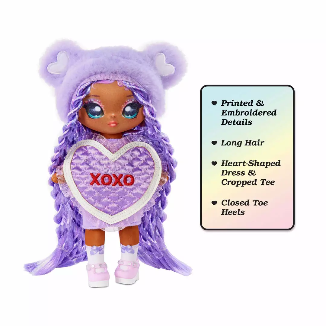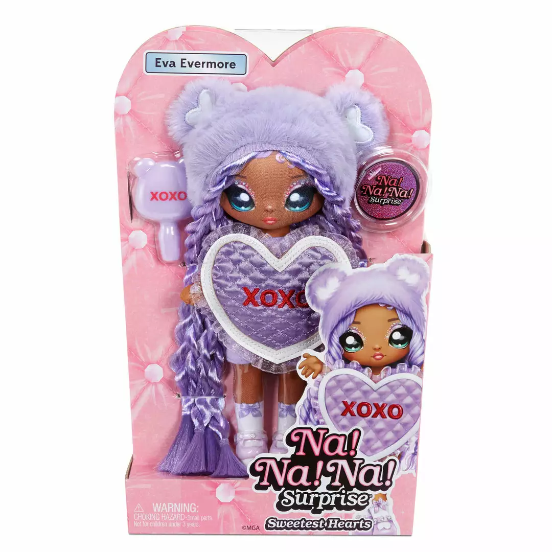 Celebrate that special someone in style with the all new Na Na Na Surprise Sweetest Hearts Fashion Doll Series! You get a soft fashion doll plus a matching brush with sweet candy heart-inspired sayings! Each doll has an adorable, quilted heart-shaped dress, bear-shaped beanie, and themed shoes to match!