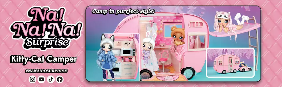 Camp in purrfect style with the Na Na Na Surprise Kitty-Cat Camper! Na Na Na Surprise soft fashion dolls can hit the road now in their own kitty-themed, cozy camper!