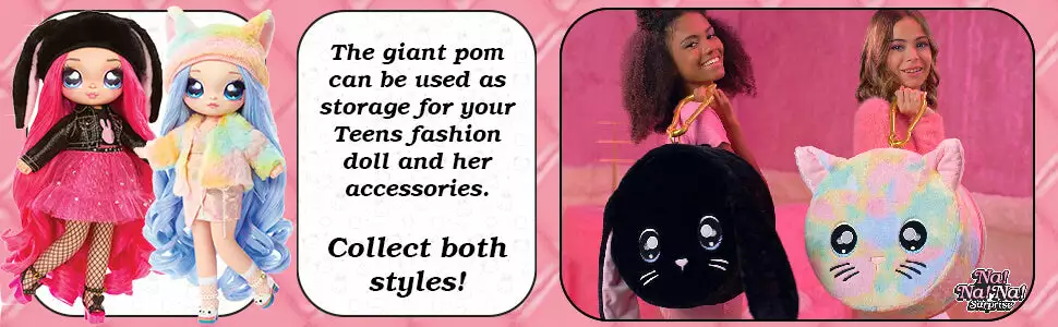 She always has the purr-fect look. Her cute, animal-themed hat is removable, so you can brush and style her gorgeous, long, purple hair. Mix and match all her fashions to create more than 100 unique looks. The giant Rainbow Kitty pom can also be used as storage for fashion doll and her accessories.