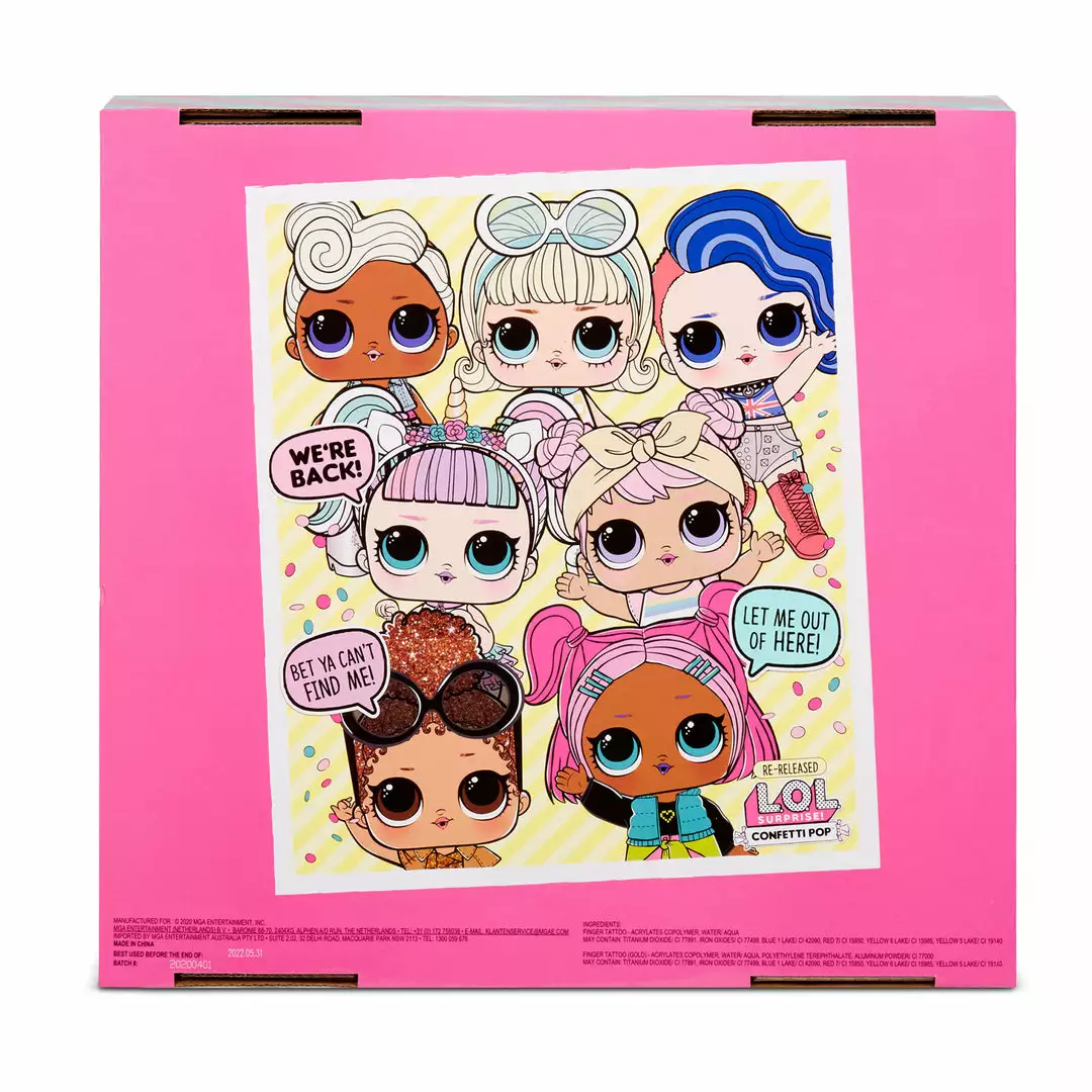 The surprise party unboxing includes a surprise POP of confetti in every ball.ย Unbox 9 layers of surprise in each ball, including an LOL Surprise doll with a water surprise. Feed or bathe your doll to reveal a water surprise. Will your doll cry, spit, tinkle or color change?