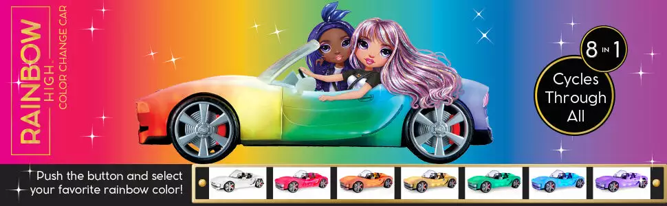 Pull up to Rainbow High in style with the Rainbow High Convertible Color Change Car. Take your favorite Rainbow High Dolls out for a spin. Why settle for one color Car when you can have the rainbow?