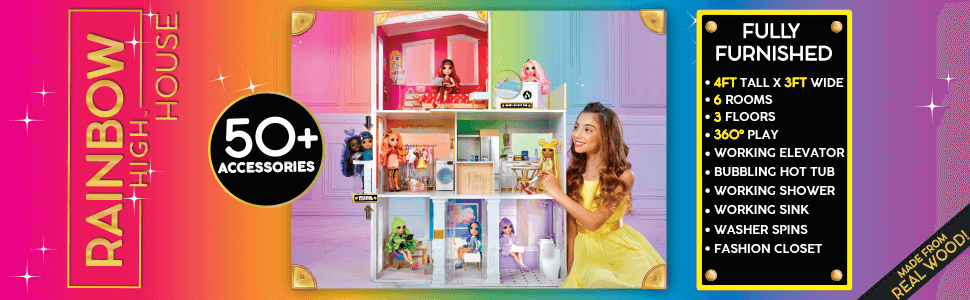 This 3-story house playset measures 4 feet tall by 3 feet wide and features 6 rooms, all-angle play, a working elevator, 50+ accessory pieces, a hot tub with working bubble effect and so much more this Rainbow High House inspires creativity and endless play for your child.